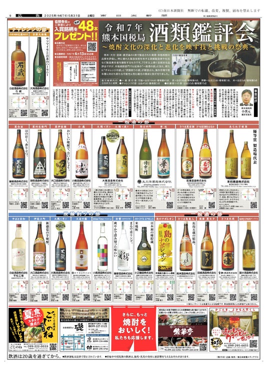 南日本新聞社は、熊本国税局の令和7年酒類鑑評会に入賞した鹿児島県内の製造場と銘柄を集めた企画広告を、2025年5月31日付朝刊で掲載しました=写真。「令和7年熊本国税局酒類鑑評会 ~焼酎文化の深化と進化を映す技と挑戦の祭典~」と題した紙面は、南日本新聞メディアプロ(本社:鹿児島市、代表取締役社長:和田茂)が企画しました。