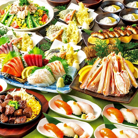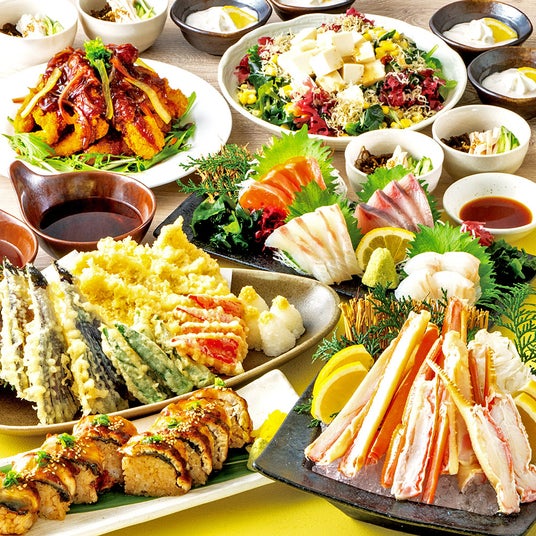 豪華食材「茹で本ズワイガニ」がメイン。「刺身四種盛合せ」「穴子と夏野菜の天ぷら盛合せ」など人気メニューが満載。2時間飲み放題が付いた全8品の充実したコースです。