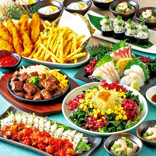 牛1頭から約3kg程度しかとれない希少部位「牛ザブトン」・を使用した「牛ザブトンひとくちステーキ」がメイン。「刺身三種盛合せ」「大葉としらすのっけ寿司」などがお楽しみいただける、2時間飲み放題が付いた全8品のカジュアルなコースです。