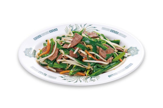 国産豚レバーとニラ、もやしを中華鍋でサッと炒めてオイスターが効いたタレで仕上げた、定食でも人気の高いメニューです。