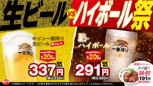 期間中、「キリン一番搾り(生)/ (中ジョッキ)」を本体価格355円(税込390円)のところ337円(税込370円)に、「陸ハイボール」を本体価格310円(税込340円)のところ、291円(税込)320円)にて販売致します。※一部、提供商品が異なる店舗がございます。