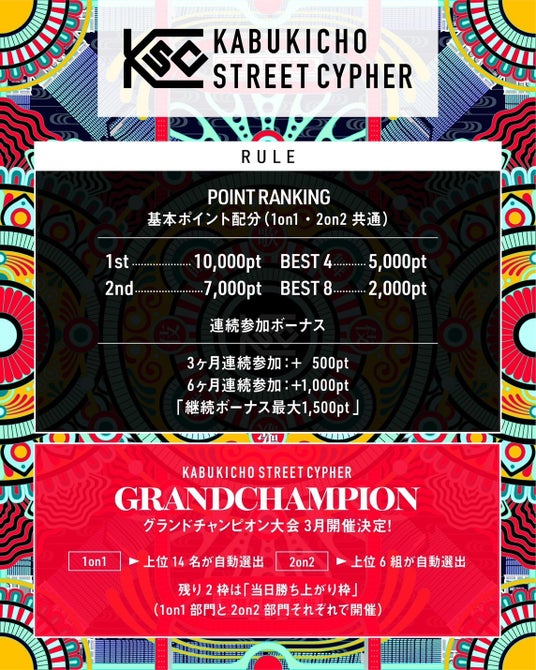 ポイント上位者は、2026年3月にZepp Shinjuku(TOKYO)で開催される、『Kabukicho Street Cypher GRAND CHAMPION』に出場することができます。歌舞伎町を、全国・世界中のダンサーにとっての“聖地”に――そんな未来を目指し、カルチャーと街が共存しながら価値を共創していく本イベント。リアルなストリートから世界へとカルチャーを発信していきます。