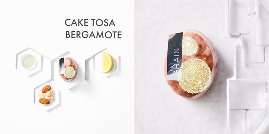 高知県産ベルガモットのコンフィチュールを練り込んだアーモンド生地に、ベルガモット果汁とジンで仕立てたシロップをしっかり染み込ませ、しっとりとしたケークに仕上げました。酸味の効いたグラスロワイヤルのコーティングで生地のしっとりさをキープ。トップのベルガモットのパート ド フリュイは、見た目の華やかさに加え、酸味や食感のアクセントにもなっています。