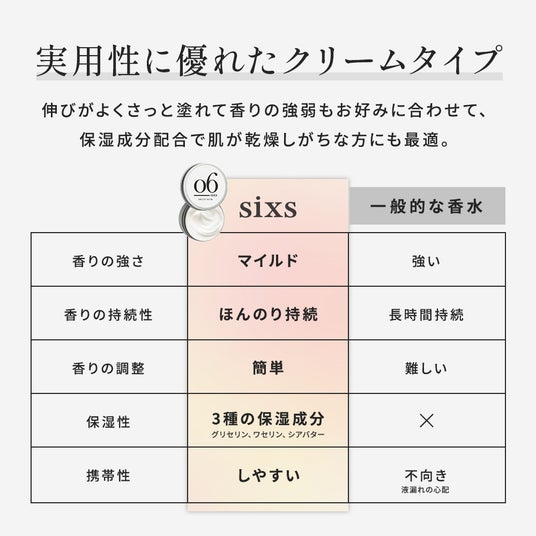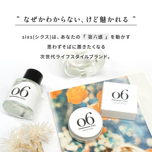 sixs(シクス)は化粧品に限らず、生活に関わる様々な商品を展開できるブランドを立ち上げようということで、弊社で初めてのユニセックス向けライフスタイルブランドです。今までユニセックスで使いやすい香水やディヒューザーを販売してきました。今回は、魅力的な香りをもっと気軽に楽しめるように、持ち運びしやすさや便利さを追求し、フレグランスクリームを開発しました。「なんかいいな」「なんか魅かれる」と第六感を感じていただけたらと思います。