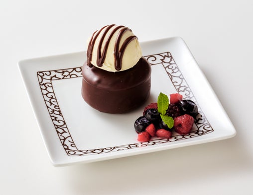 くちどけの良いたっぷりクリームをチョコレートで丁寧に包み込んだ「生 チョコパイ」に、バニラアイスをのせました。甘酸っぱいミックスベリーと一緒にどうぞ。