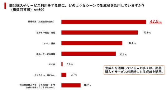 購買行動における生成AIの活用シーンとしては、「情報収集」が47.5%、「自分との相性や適正」を調べるために利用するという答えが42.9%、「口コミや評価」を調べるが34.2%という結果になりました。