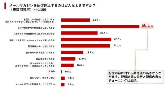 一方で、メールマガジンの配信停止を決める理由を問うと、「自分の興味がない情報ばかり届いたとき」が66.1%となっています。これらの結果から、メールマガジンの効果を上げるためには、ユーザーにとって役に立ち、興味のある情報を届けていくことが重要と考えられます。