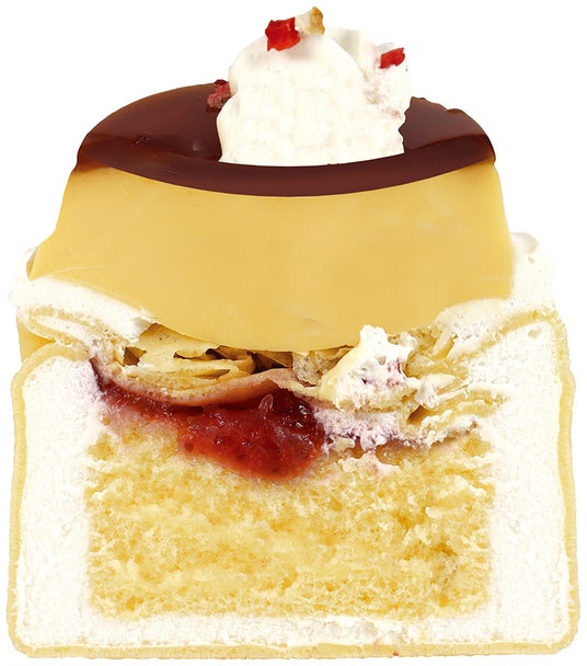 第2弾は、1970年代に東京・原宿から大流行したと言われているスイーツ“クレープ”と当時流行したファッションである“ヒッピースタイル”を象徴する花柄を敷紙デザインに取り入れたケーキです。シフォン生地と苺ジャム、シャンテリークリームをクレープで包み込み、上面にプリンをのせたボリューミーな一品。ヒッピースタイルを思い起こさせる花柄の敷紙で、レトロ可愛く仕上げました。