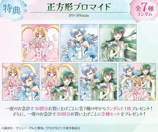 一度のお会計で10回分ご購入ごとに特典正方形ブロマイド(全7種)の中からランダムで1枚、20回分ご購入ごとに全種セットプレゼント!