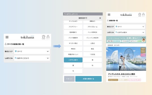 トキハナの式場検索ページにおいて、「条件やこだわり」内に「LGBTQ+婚OK」タグを新設。