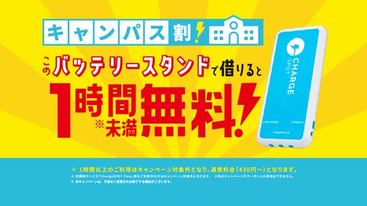 モバイルバッテリーのシェアリングサービス「ChargeSPOT(R)(チャージスポット)」を運営する株式会社INFORICH(本社:東京都渋谷区、代表取締役 Group CEO:秋山 広宣、以下 INFORICH)は、2025年6月1日(日)から、全国の大学・専門学校等に設置している「ChargeSPOT」において、最初の1時間を無料でご利用いただける“キャンパス割”を本格展開いたしました。