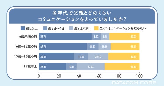 回答者の過去の各年代における父親とのコミュニケーションの頻度を聞いたところ、「週5日以上コミュニケーションを取る」という回答が最も多かったのは6歳未満で52.7%。6歳~12歳では47.7%、13歳~18歳では34.8%、19歳以上では27.3%と成長と共にコミュニケーションの頻度が減少しています。ただし、「全くコミュニケーションを取らない」の割合は年代間の差異が少なく、「週2日未満」が成長とともに増加していることから、子供が成長するにつれて忙しくなることで顔を合わせる時間が減少していることが考えられます。