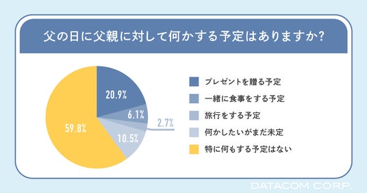 父の日の予定については、59.8%が「特に何もする予定はない」と回答。一方で、父の日の予定がある人の中では、「プレゼントを贈る」が最多の20.9%、続いて「一緒に食事をする予定」6.1%、「旅行をする予定」2.7%となりました。