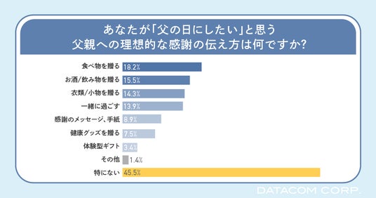 「父の日にしたい」と思う理想的な感謝の伝え方を聞いたところ、「特にない」が45.5%と半数近くは関心が無いです。一方で、予定を立てている人の回答では、こちらもプレゼント系が上位に並びました。最も多かったのが、「食べ物を贈る」18.2%。次いで、「お酒/飲み物を贈る」15.5%、「衣類/小物を贈る」14.3%となっています。飲食物のプレゼントが理想的な贈り物と考える人が多いようです。