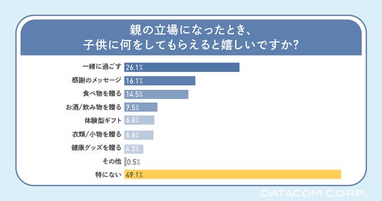 自分が親の立場になった際に、子供にしてもらって嬉しいことを聞いたところ、「一緒に過ごす」が26.1%と最多になりました。次点も「感謝のメッセージ」16.1%になっており、時間や気持ちといった、プライスレスな感謝の方法が好まれることが分かりました。