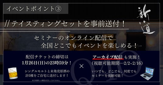 そして、配信参加の皆様にも事前にテイスティングセットの送付を行います。福岡初の蒸溜所が織りなすウイスキーを全国各地でお愉しみください。