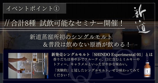 今回のイベントでは、日本酒蔵元としての経験を活かし、情熱あふれるクラフトマンシップを持って、ウイスキーづくりに取り組む造り手の方々と直接交流できる貴重な機会です!また、独創性を追求する新道蒸溜所ならではのこだわり抜いたウイスキーを、解説と共に違いを感じながらテイスティングできます。