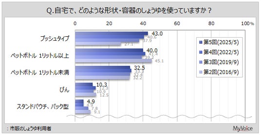 市販のしょうゆ利用者が使っているしょうゆの形状・容器は(複数回答)、「プッシュタイプ」が43.0%で過去調査と比べて増加傾向です。以下、「ペットボトル 1リットル以上」が40.0%、「ペットボトル1リットル未満」が32.5%で続きます。