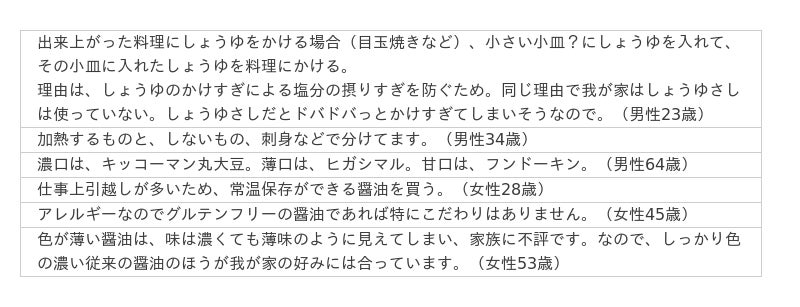 しょうゆの利用状況や購入時の重視点などについて聞いています。調査結果をお知らせいたします。