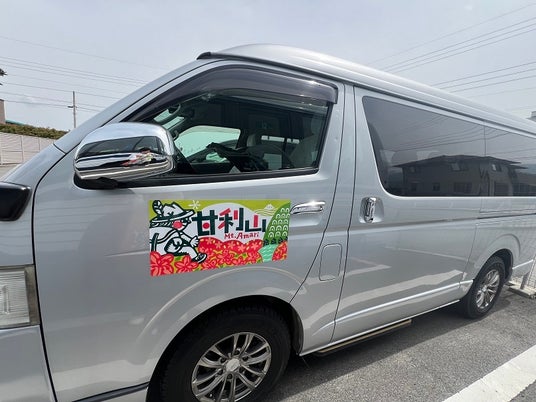 今年はジャンボタクシーを確保。1便9名様まで予約が可能に。乗車特典のオリジナルステッカーと同デザインのバナーをあしらった車両が目印。