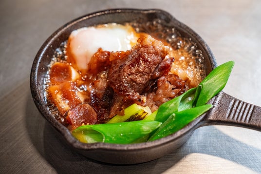 国産牛のすき焼き風 九条ネギ 半兵衛麩 温度卵シェフが丁寧に鉄板でお肉を焼き上げ、1人前ずつ提供する“小さなすき焼き”は、温度卵のなめらかなコクが加わることで旨みが際立ちます。素材の旨みをしっかり閉じ込めた完成度の高い一品です。