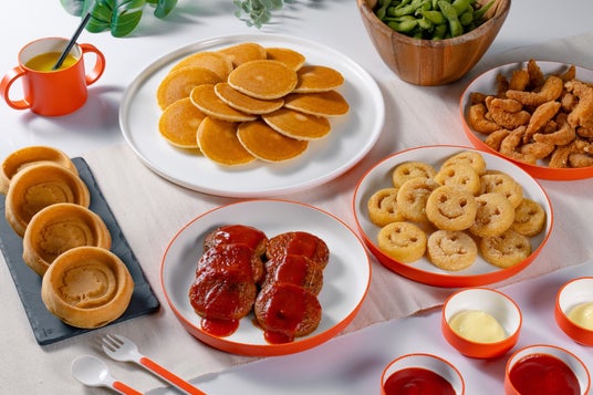 枝豆/ミニハンバーグ/ポップコーンシュリンプ/スマイルポテト/ケチャップ マヨネーズ/スナック菓子/ダブルツリーワッフル/パンケーキ シロップ ソース 付け合わせ