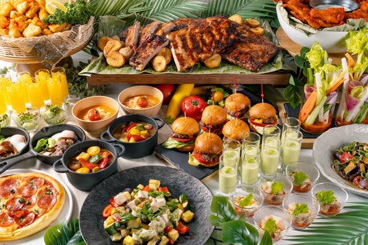 BBQバックリブ/バッファローウィング/フィッシュアンドチップス/ペパロニピッツァ/夏野菜入りヒルトンオリジナルカレー/御飯/パルメザンチーズ香るトマト豚骨ラーメン/ミニスマッシュバーガー/国産牛のすき焼き風 九条ネギ 半兵衛麩 温度卵