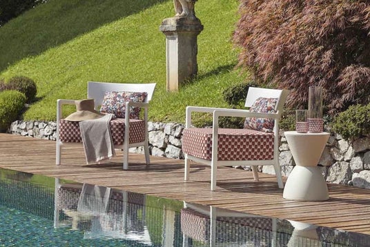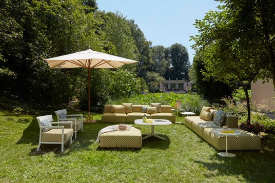 屋外で本格的なリビングスタイル空間を提供するモジュラー式ソファシリーズ「プラスティックスアウトドア|Plastics Outdoor」に世界中で注目される英国テキスタイルブランド「リバティ|Liberty」のファブリックが登場します。ファブリックは、屋外での使用に耐える充分な強度と耐久性を兼ね備えたスペシャルメイド。幾何学パターン2種、フラワーパターン1種の3つのパターンからコーディネートが可能です。
