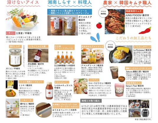 また、湘南の釜揚げしらすや漬けしらす、地元の新鮮野菜を贅沢に使用した地産地消キムチ、老舗和菓子店の栗蒸し羊羹やくずアイスなど、神奈川県内のこだわりの22の生産者団体が集結します。
