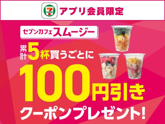 期間中、セブン‐イレブンアプリを提示して「セブンカフェ スムージー」を5杯購入ごとに、「セブンカフェ スムージー」が100円引きになるクーポンを1枚プレゼントいたします。