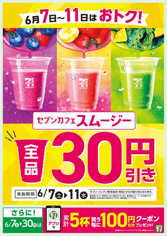 株式会社セブン‐イレブン・ジャパン(本社:東京都千代田区、代表取締役社長:阿久津 知洋)は、6月7日(土)から11日(水)の期間限定で、野菜やフルーツを簡単&気軽に摂取できる「セブンカフェ スムージー」を全品30円引きにて販売いたします。また、6月7日(土)から30日(月)の期間限定で、セブン‐イレブンアプリを提示して「セブンカフェ スムージー」を5杯購入ごとに、「セブンカフェ スムージー」いずれか1杯が100円引きになるクーポンをプレゼントします。