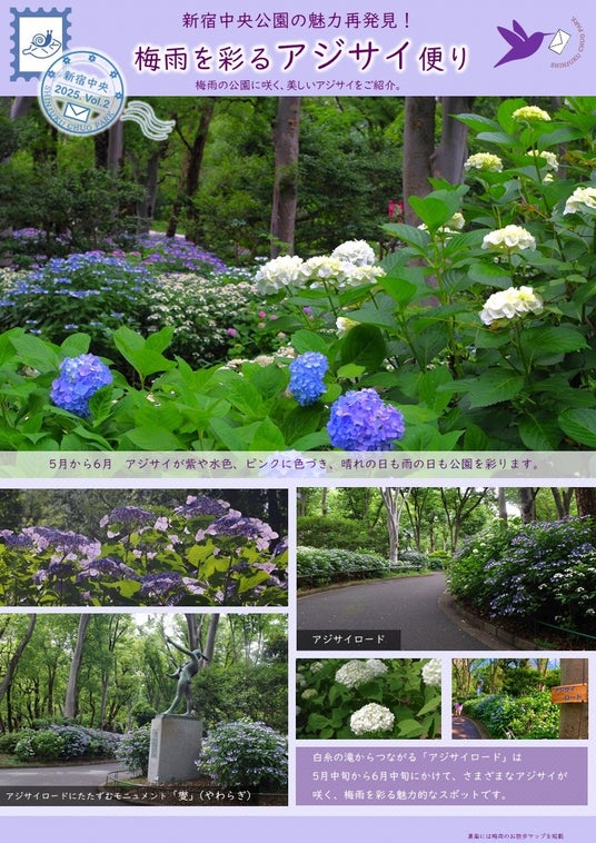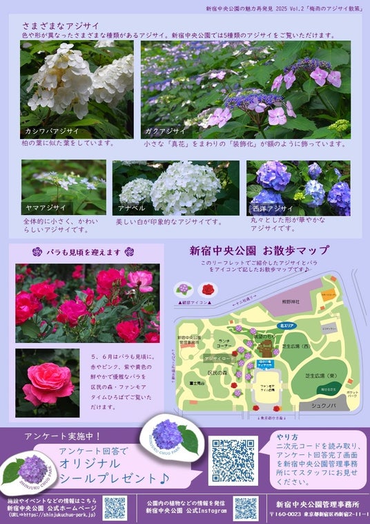 アジサイや見ごろのバラが咲いている場所がわかるアジサイマップを記載したセルフリーフレット「新宿中央公園の魅力再発見!梅雨を彩るアジサイ便り」を、園内の各チラシラックで配布中です。是非お手に取ってご覧くださいませ。