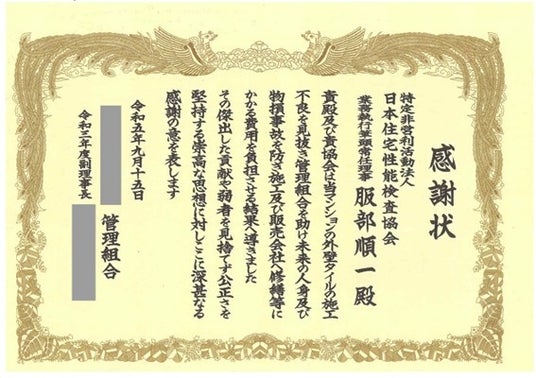マンション外壁トラブルを解決した際、管理組合様から感謝状をいただきました。