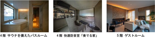 1階は、賃貸収益を得られる店舗の他、2台分駐車可能なビルトインガレージを想定し、重量鉄骨造における大空間・大開口を実現。2階の親世帯住居スペースは、リビングに坪庭を設置するなど、落ち着いた和モダンな空間とし、将来は賃貸スペースに変更することも可能です。室内階段でつながる3階・4階の子世帯住居スペースには、当社の特長である2,720mmの天井高と吹抜けを組み合わせた開放的なLDK(42帖)を設けました。4階には、バルコニーにつながるサウナを備えたバスルームや、シアタールームを想定した当社オリジナルの快適防音室「奏でる家」を採用。都市部で需要の高い豊かな音環境や多様なニーズに応えた快適な住空間を提供します。