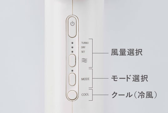 髪のコンディションや目的に合わせて選べる6つのモードを搭載。髪のドライからスタイリング、ツヤ出しの流れをワンアクションで叶えます。また、風量の設定は「ターボ」、「ドライ」、「セット」の3段階。「ターボ」や「ドライ」で全体を乾かし、やさしい風の「セット」で「ニュアンスドライモード」を使うのがおすすめです。