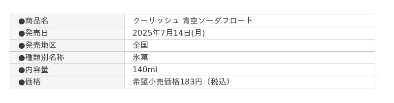 株式会社ロッテ(東京都新宿区、代表取締役社長執行役員:中島英樹、以下 ロッテ)は7月14日(月)に、“飲むアイス”の「クーリッシュ」ブランドから、『クーリッシュ 青空ソーダフロート』を発売します。夏の王道フレーバーであるソーダフロート(アイスが混ざってほんのりバニラを感じるソーダ)の味わいが楽しめる仕立てです。「発泡感を想起させる香り」と「口内に刺激を与える成分」の相乗効果で、疑似的に炭酸を感じられる香料を使用し、ソーダフロートらしい味わいを目指しました。商品デザインも夏の青空をイメージした3デザイン+虹の架かったレアデザインの合計4デザインとなります。夏にぴったりな“飲むアイス”の新商品をぜひお楽しみください。