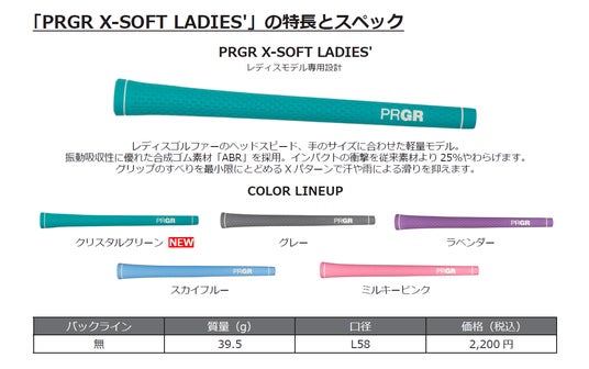「PRGR X-HOLD GRIP」は、「perfect pro」の独自素材「ABR」を採用し、ミスヒット時の余計な振動を吸収するとともに、快適な握り心地を実現。X状のグリップパターンがホールド感を高めるとともに、一般的なラバーグリップに比べ劣化しにくいのも特長です。ソフトなフィーリングとホールド感を両立する「RUBBER」としっかりした握り心地で操作性の高い「CORD」の2種類をラインアップし、アベレージゴルファーからハイレベルゴルファーまで幅広く対応します。「PRGR X-SOFT LADIES'」にも同じく「ABR」、X状のグリップパターンを採用したほか、女性ゴルファーが握りやすく振りやすいサイズ、質量に設計しています。