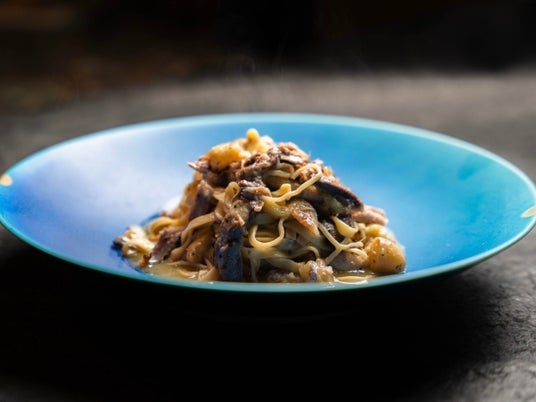 鮑を3~4時間煮込み、出汁と鮑、黒オリーブ、ドライトマトの深みのあるソース。合わせるのは、イタリア伝統の手打ちパスタ「キタッラ」。凹凸のある四角い麺に、魚介の旨みが溶け込んだオイルソースがよく絡み、ひと口ごとに海の恵みを感じられる、滋味豊かな一皿です。