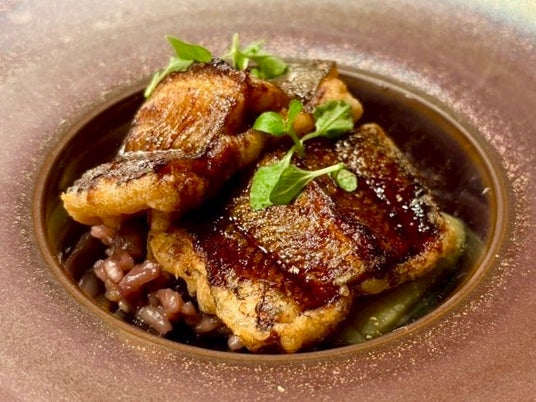 三陸産一級品のふっくらとした穴子を、赤ワインで炊き上げた十五穀米のリゾットとともに仕立てた、洋風の蒲焼丼。穴子の身にはベニエ生地をまとわせてフリットにし、皮目にはポルト酒・穴子の骨・牛すじでとった特製の洋風蒲焼ソースを塗って香ばしく焼き上げました。洋食の調味料のみで仕上げた、〈赤ワイン×穴子〉という意外性のある組み合わせが、口の中で静かな驚きを呼び、記憶に残る余韻を添えます。