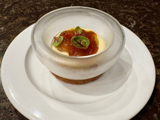 旬の玉蜀黍(とうもろこし)の自然な甘みだけで仕上げた口どけなめらかなムースに重ねるのは、富山直送の新鮮なボタンエビ。仕上げにあしらわれたコンソメジュレが全体を優しく包み、素材本来の旨みを引き立てます。
