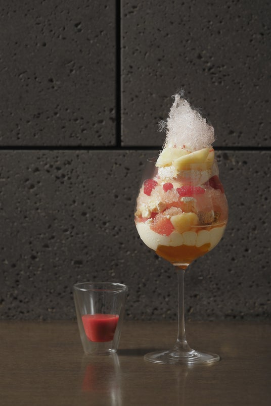 グラスの中には、ピーチジャスミンのジュレとなめらかでクリーミーなディプロマットクリームをベースに、コンポートした桃とグレープフルーツをたっぷりと敷き詰めました。柑橘の酸味が桃の濃厚な甘さを引き立て、間に挟んだアマレッティはザクザクとした軽快な食感と香ばしさを演出します。さらに、ラズベリーのソルベ、白桃のソルベ、桃とシャンパーニュのグラニテのさっぱりとした層が続き、白桃クリームのやさしい甘さが上品な味わいです。そして、ふんわりと焼き上げたココナッツのムラングシャンティとフレッシュの桃、飴細工をトップに飾り、桃のその風味を何層にもお愉しみいただけるパルフェに仕上げました。