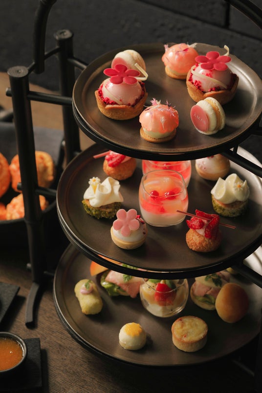 上段では、ダージリン茶葉を混ぜ込んだアーモンドクリームのタルトに、白桃と赤桃のムースを乗せた「桃とダージリンティーのタルト」を中心に、ライチの香りが華やかな、桃のヴェールを纏わせたとろける食感のムースや、桃とオレンジのマカロンなど、桃のように丸く愛らしい形をしたスイーツがトレーを彩ります。また、中段には、桃とラズベリーのシューのほか、白桃クリームをトッピングに添えたピスタチオのフィナンシェや、桃のジュレと一緒に味わうパンナコッタといった、バリエーション豊かに桃のフレーバーと甘みを感じられるスイーツが並びます。