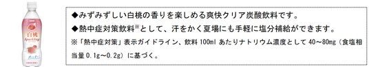 「ミスティオ 白桃スパークリング」は、みずみずしい白桃の香りを楽しめる炭酸飲料です。ナトリウムを40mg(100ml当たり)以上配合し、夏場の熱中症対策※として、手軽においしく塩分補給もできます。