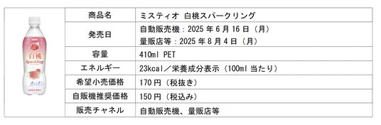 また、「ミスティオ 白桃スパークリング」は、当社自動販売機で展開中の、生活に寄り添った価格でお届けする「ハートプライス」商品シリーズの対象商品です。