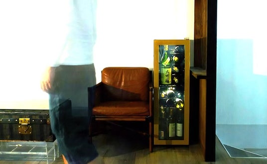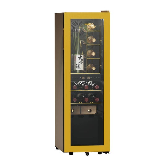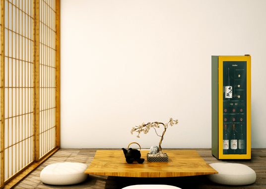 ワインセラーの「サカリュエ 潤金」は、温度設定機能はもちろん、和の空間でも重くなりすぎない山吹色のフレームがこだわり。