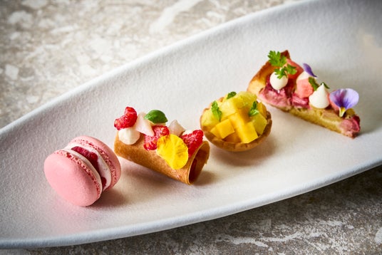 開業2周年を祝し、夏の彩りと旬のフルーツを詰め込んだ特別なアフタヌーンティーをご用意しました。暑い夏でもすっきりと楽しめるよう、果実のフレッシュさとジューシーさを活かした“涼やかで軽やか”な味わいが特徴です。プレートでご用意する4種類のスイーツは、甘さ控えめのバタークリームと甘酸っぱいラズベリーをサンドした「ラズベリーマカロン」、爽やかなライムの香りが漂い、口の中でマンゴーとパインがジューシーに広がる「トロピカルタルト」、ハーブの一種でデトックス効果が期待でき、その酸味が魅力のルバーブ*にスイカとマスカルポーネクリームを合わせた「サマータルトケーキ」、そしてラズベリーゼリーやマスカルポーネクリームを包み込んだロールの上に、ライチ、バジル、ラズベリーなどをあしらった「ベリーハーバルロール」は、ベリーの甘酸っぱさにバジルの爽やかな香りが重なり、意外性がありながらも驚くほど相性抜群の一品です。
