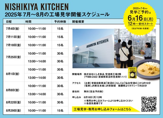 「世界の料理を『カンタン』に。」をコンセプトに掲げ、レトルトカレーを中心に約120種類のレトルト食品を販売する専門店NISHIKIYA KITCHEN(ニシキヤキッチン)(株式会社にしき食品 本社:宮城県岩沼市、代表取締役社長:菊池洋一)は、2025年6月16日(月)12:00より、宮城県岩沼市で開催中の「ニシキヤキッチン工場見学」の7月~8月分の予約枠を通常の2倍に増枠し、予約受付をスタートします。