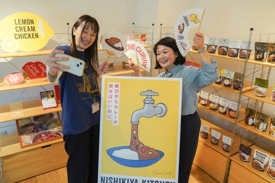 ニシキヤキッチンの商品が全商品並んでいる棚の前で記念写真を撮影できます。好きなカレーやオリジナルグッズと一緒に撮影し、夏休みの思い出を写真で残せます。7/4(金)の見学から、新しく手持ち顔出しパネルが登場予定!