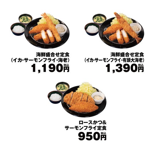 海鮮フライ好きの皆様、またまた朗報です。衣はサクッと、中身はフワッと食感の「サーモンフライ」が復活します。松のやのサーモンフライは、鮮やかな赤みが特徴で、身がふっくらと柔らかく脂がのった「ピンクサーモン」を使用しています。サクサクな衣の食感からサーモンの旨味までじっくり楽しめる逸品です。そんな「サーモンフライ」と、噛めば噛むほどにイカの旨味がたっぷり感じられる「イカフライ」、ぷりっぷりの海老の食感が楽しめる松のや自慢の「海老フライ」との豪華海鮮トリオ「海鮮盛合せ定食」を発売いたします。お肉と海鮮を同時に味わいたい方には、「ロースかつ&サーモンフライ定食」をご用意。海鮮フライをより引き立たせる松のや特製のタルタルソースもついた期間限定商品の海鮮フライの定食を、ぜひご賞味ください。