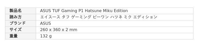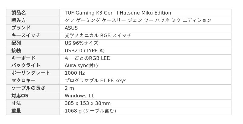 ASUS JAPAN株式会社は、2025年5月12日に発表しました、TUF Gamingと初音ミク(とのコラボレーションしたゲーミングデバイス4製品の発売日を決定いたしました。キーボード「TUF Gaming K3 Gen II Hatsune Miku Edition」、マウス「ASUS TUF GAMING Mini Wireless Mouse Hatsune Miku Edition」、マウスパッド「ASUS TUF Gaming P1 Hatsune Miku Edition」、およびヘッドセット「TUF Gaming H1 Gen II Hatsune Miku Edition」を6月20日より発売開始します。